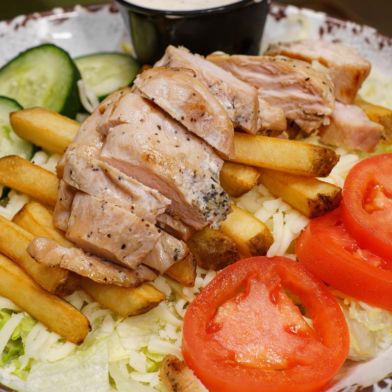 Our marinated grilled chicken. Served overtop a bed of lettuce, tomatoes, cucumbers, onions, fries, and cheese.